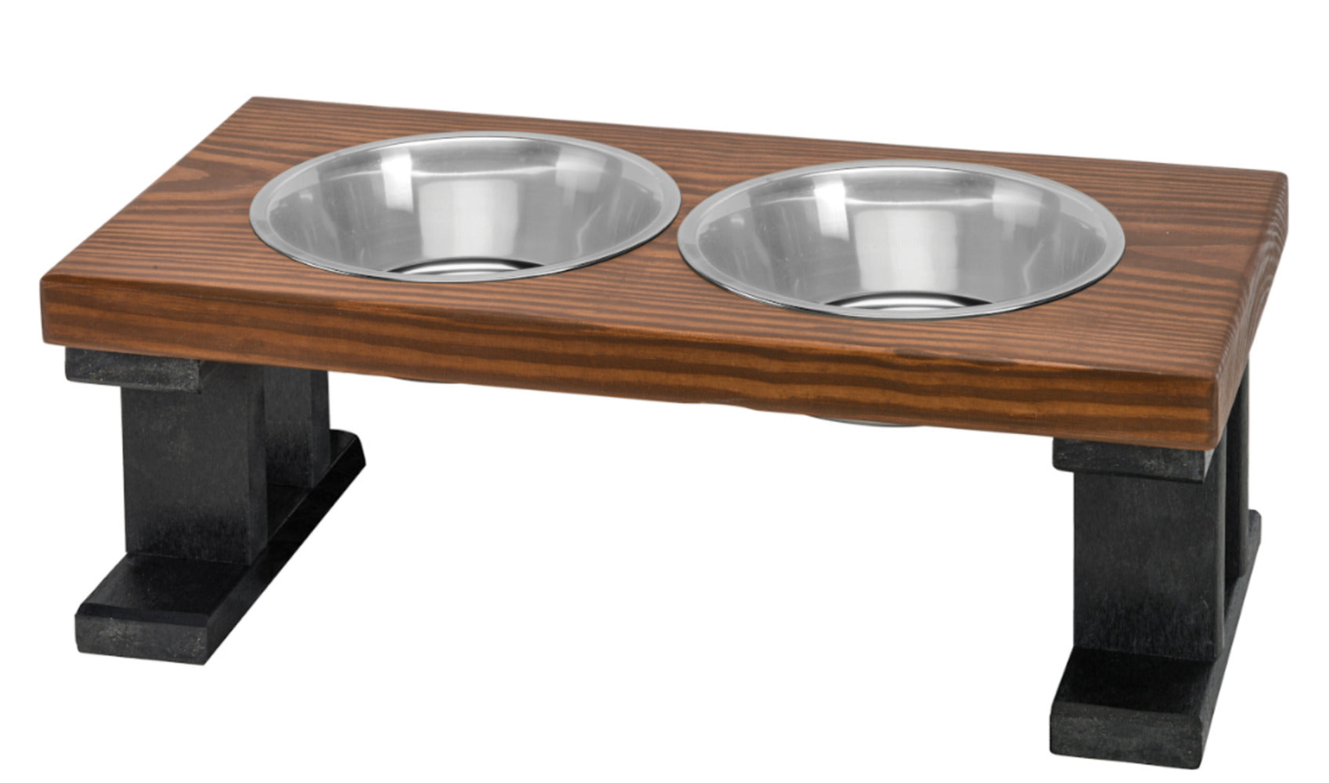 Keep your pet’s food station looking modern and stylish with this modern stained dog food station. This wooden pet feeding table is handmade with recycled materials and features two stainless steel bowls for food and water. The elevated design of the feeder helps to improve digestion, reduce neck strain and keep pets neat and clean during mealtime. Perfect for any farmhouse-style decor, this pet feeder also makes a great gift.