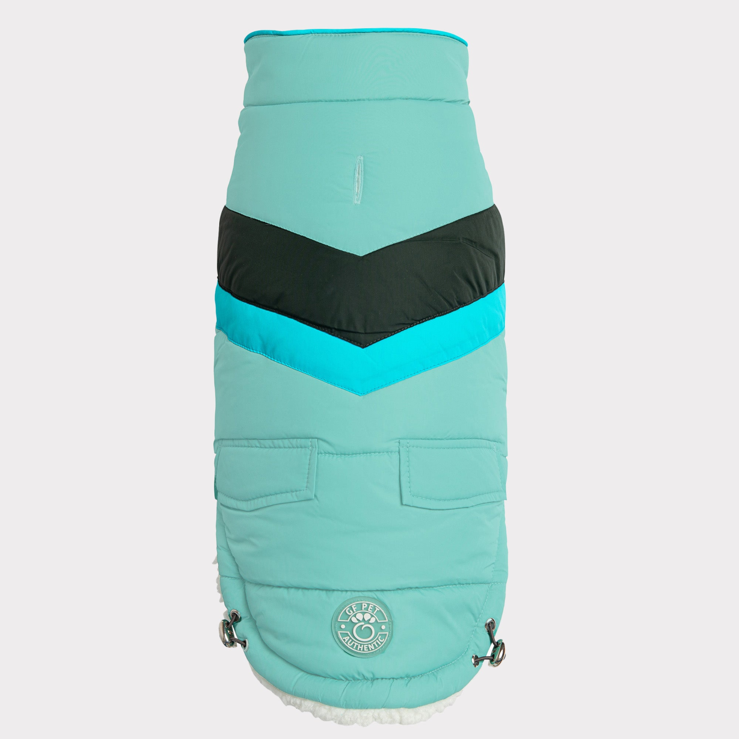The GF Pet Alpine Puffer is a great choice for active dogs who are looking for carefree fashion and warmth. It’s a modern take on a retro chevron design, with faux pockets and next-generation styling. With GF Pet signature contrast piping and snuggly-warm, popcorn Sherpa lining, the Alpine Puffer keeps it real. Water repellent and super-adjustable, with patented Elasto-Fit technology, this coat is designed to keep dogs looking cool while staying warm.