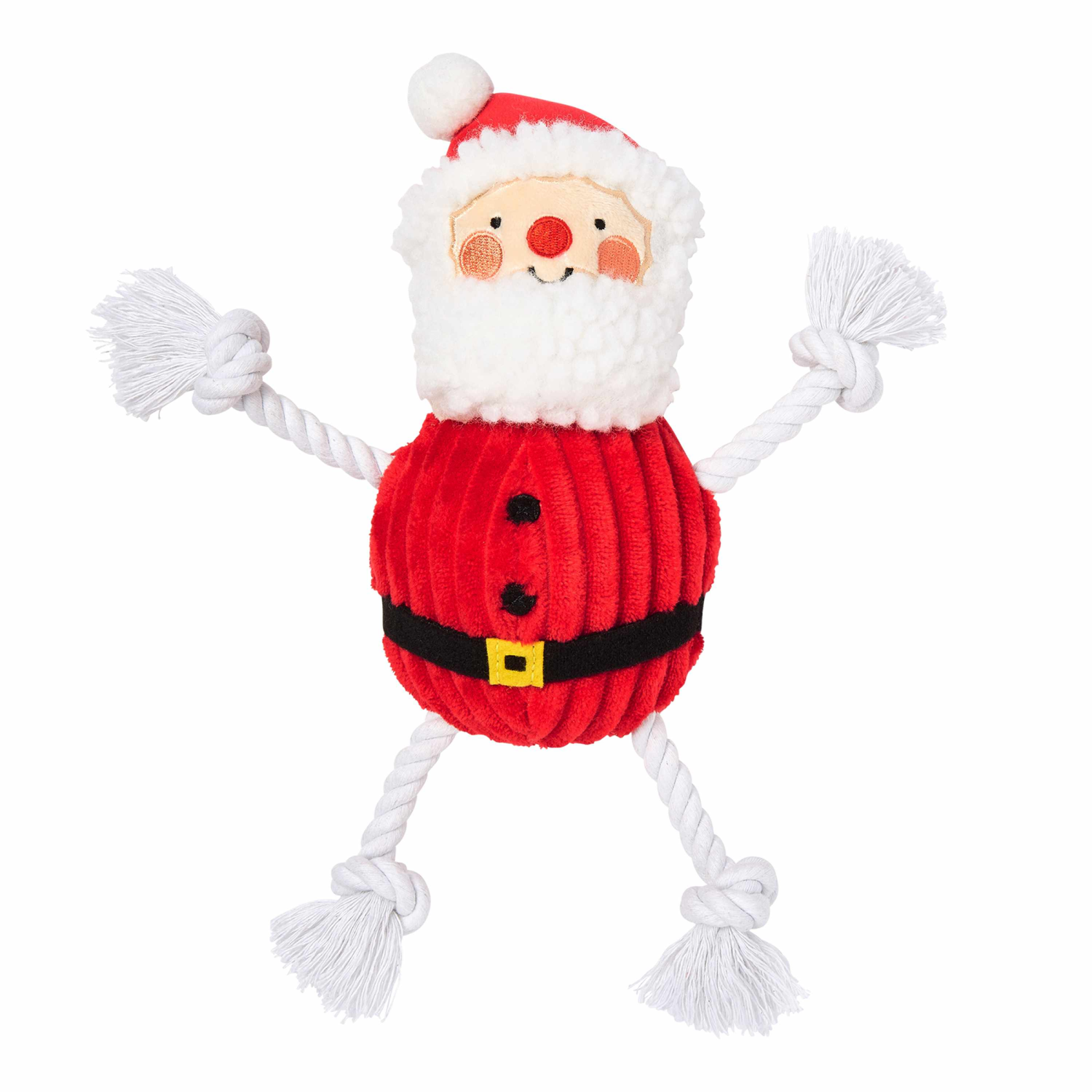 This adorable holiday toy is made up of plush corduroy, stuffing, four ropes and a plastic squeaker. Great for small or medium dogs.