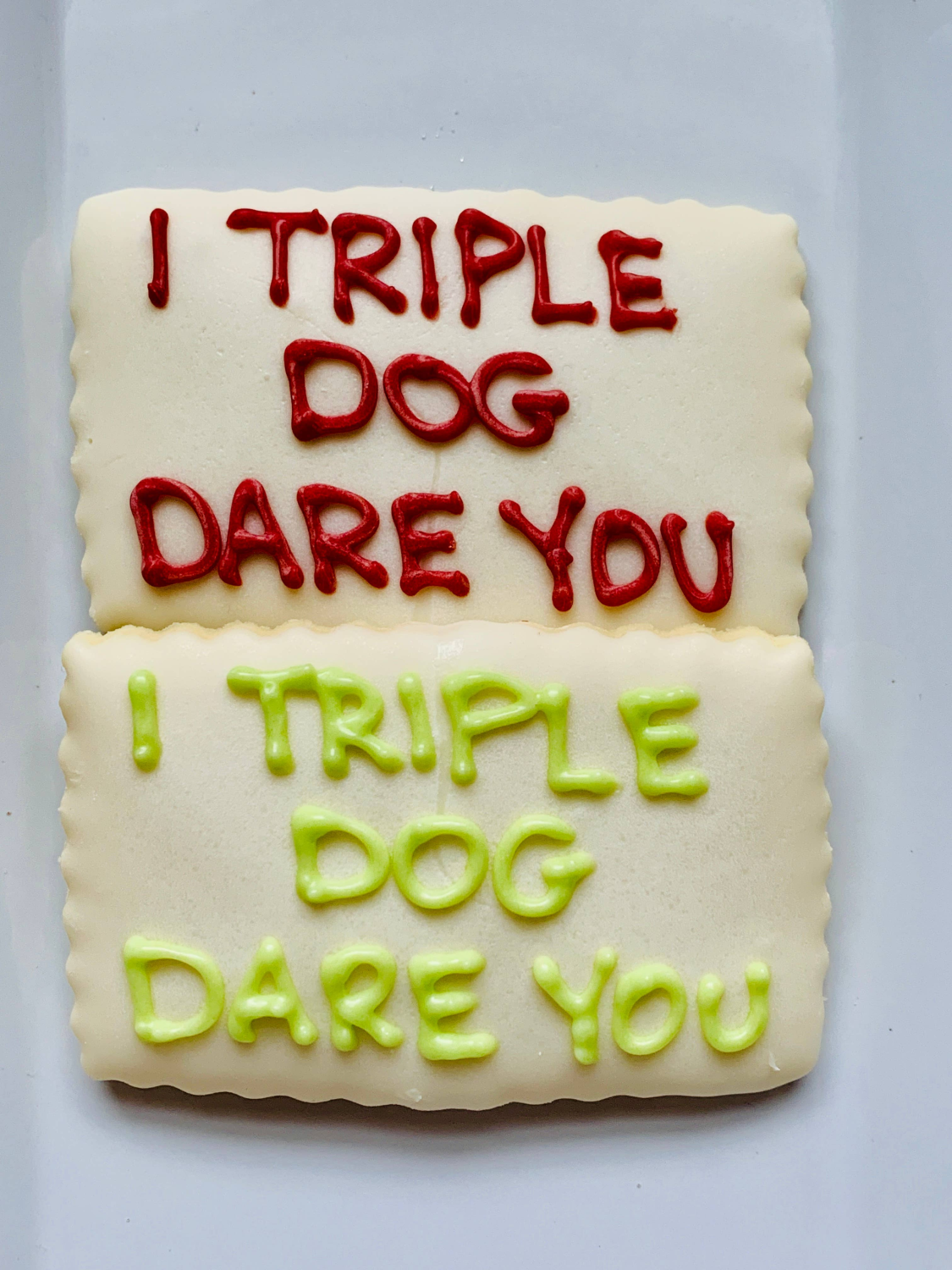 Everyone loves this holiday triple threat…so we honored it in a cookie! The Triple Dog Dare is a shortbread cookie, dipped in vanilla icing and trimmed with the words I Triple Dog Dare You in both green and red vanilla icing.