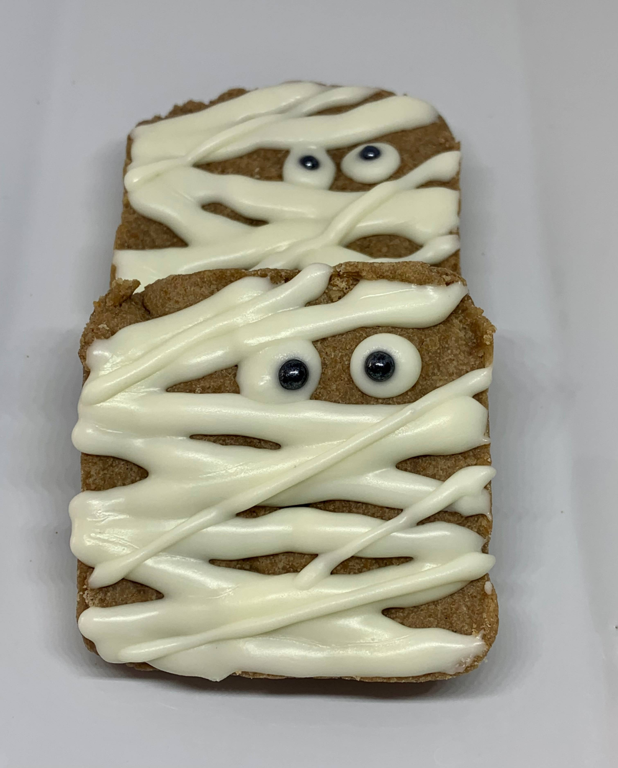 Chewy dog brownie drizzled with vanilla icing to look like a Mummy.