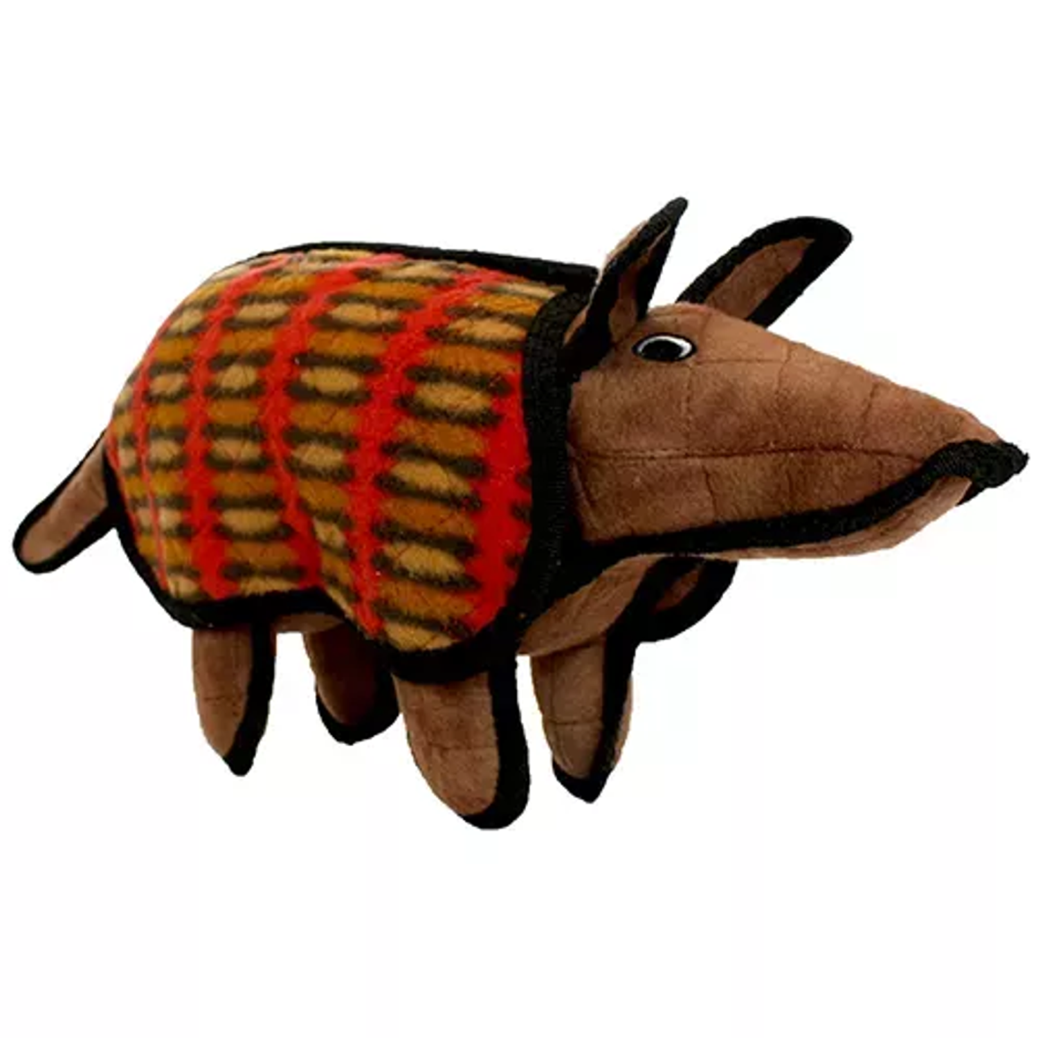 Tuffy Desert Armadillo. Great for interactive play with one or multiple dogs. Best for dogs who like to whip their toys and play tug for hours. Floats in water, and its machine washable, (air dry). 4 LAYERS OF MATERIAL Tuffy Ultimate toys are made with UP TO 4 layers. 1 layer soft fleece on the outside. 1 to 2 layers of industrial grade luggage material on the inside. 1 layer of plastic coating on the inside.